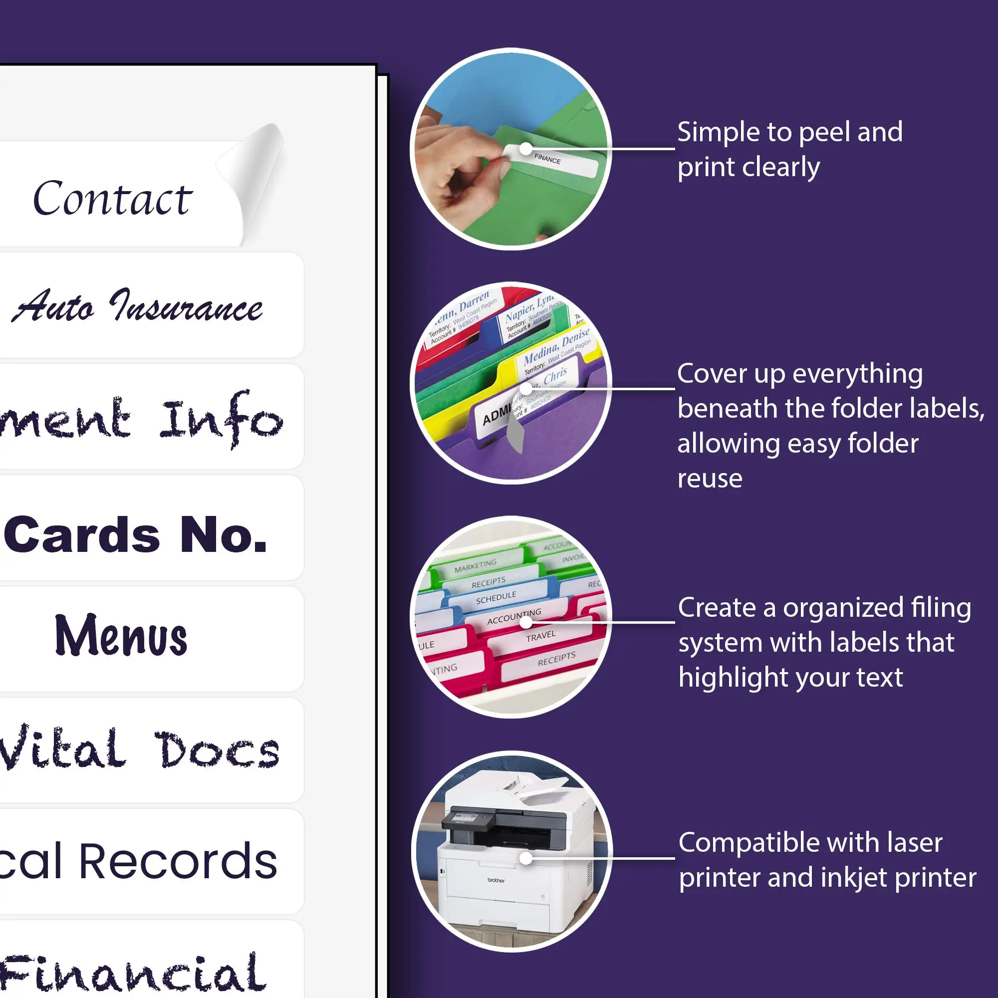 • Ideal for labeling folders - great for home or office file cabinet organization - also perfect as address labels and wrap-around product labels